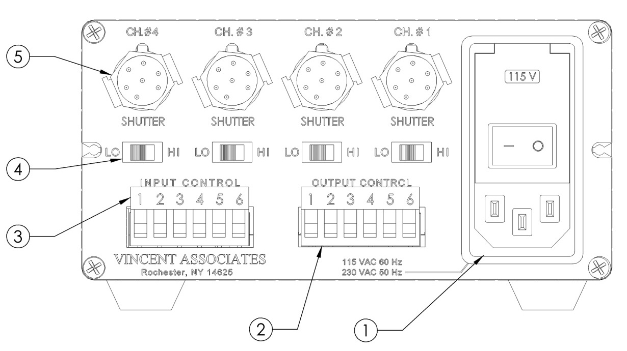 | LO/HI Select Slide Switch (4) | “HI” position allows the selection of appropriate pulse energy for 35 mm and larger shutters.“LO” Position for shutters 25 mm and smaller aperture. One for each channel. Channel #4 slide switch provides no function in the VMM-D4. |