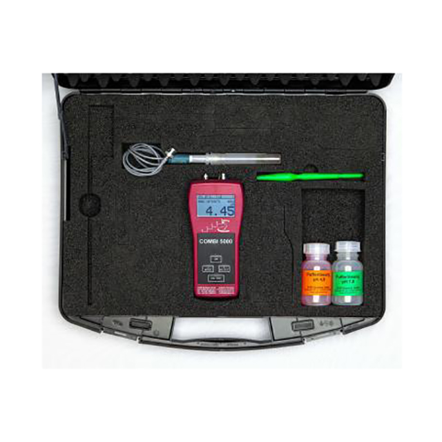 pH 5000 basic device including data logger function, pH puncture probe, buffer solution pH 4 and 7 100 ml each, piercing mandrel, operating instructions with guideline values, sturdy case.