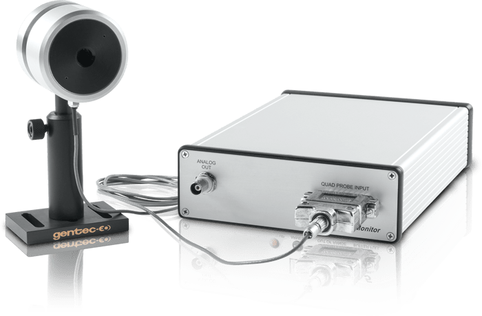 The analog output of the QUAD-4TRACK provides voltage that is directly proportional to the pulse energy or laser power irradiating each QUAD element. When the four voltage outputs are equal, the beam is centered on the QUAD detector. This provides a very useful tool when setting up our QUAD probes with your source for optical alignment.
